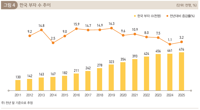 보고서에 따르면 2025년 기준 한국의 부자 수는 약 47만 6천 명입니다.