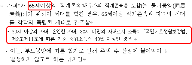 - 다만, 30세 미만의 자녀라 하더라도 일정 소득이 있고 따로 사는 경우에는 별도의 세대로 볼 수 있도록 예외