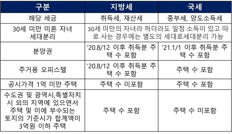 - 배우자와 미혼인 30세 미만의 자녀는 주택을 취득하는 자와 같은 세대별 주민등록표에 기재되어 있지 않더라도 같은 세대로 본다.
