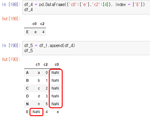 위 그림에서 보시는 것 처럼, 서로 갖고 있지 않은 컬럼에 대해서는 'NaN' 처리를 하면서 행이 추가 됩니다.