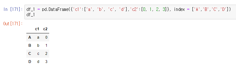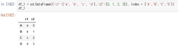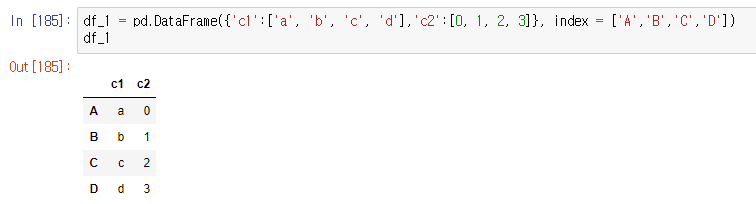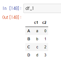 123import pandas as pddf_1 = pd.DataFrame({'c1':['a', 'b', 'c', 'd'],'c2':[0, 1, 2, 3]}, index = ['A','B','C','D'])df_1cs <실행 화면>