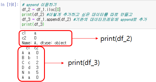 먼저 df_2를 df_1에서 첫번째 행을 추출하여 만들어 놓습니다. print(df_2)를 참고해 주세요. 그 이후에, 기존의 데이터프레임 df_1에 새로 만든 df_2를 append로 추가하여 df_3을 만들어 낸 것입니다. 만약에 append를 사용할 때, 기존 데이터프레임과 추가할 데이터 프레임의 컬럼 명이 동일 하지 않다면 아래와 같이 append 됩니다.