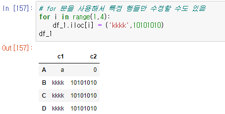 # for 문을 사용해서 특정 행들만 수정할 수도 있음for i in range(1,4):df_1.iloc[i] = ('kkkk',10101010)df_1cs <실행 화면>