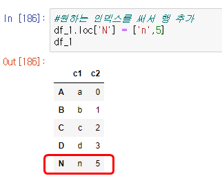 #원하는 인덱스를 써서 행 추가df_1.loc['N'] = ['n',5]df_1cs <실행 화면>