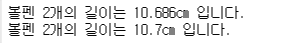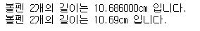 something = '볼펜' EA = 2 one_length = 5.343 scale = 'cm' print('{} {}개의 길이는 {}{} 입니다.'.format(something, EA, one_length*EA, scale)) #실수 포맷팅 소수점 반올림 하기 print('{} {}개의 길이는 {:.2f}{} 입니다.'.format(something, EA, one_length*EA, scale))