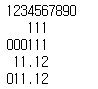 print(1234567890) #자릿수를 표현하기 위해서 적음 print('%6d'%(111)) # 6자리를 가진다. print('%06d'%(111)) # 6자리를 가지고, 빈자리를 0으로 채운다. print('%6.2f'%(11.123124)) # 총 6자리 가지고 소수점 이하 둘째자리까지 표현 print('%06.2f'%(11.123124)) # 총 6자리 가지고 소수점 이하 둘째자리까지 표현, 빈자리는 0 채움