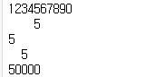 print('{}'.format(1234567890)) print('{:>10}'.format(5)) # >는 오른쪽정렬 print('{:<10f}'.format(5)) # <는 왼쪽정렬, 실수는 기본적으로 소수점6자리까지 표현 print('{:^10.2f}'.format(5)) # ^는 가운데정렬, 10을 썼으니 10자리 기준 가운데 정렬, 소수점 2자리 감안해서 가운데 정렬