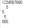 print(1234567890) #자릿 수 표현 위함 print('{:>3}'.format('5')) # >는 오른쪽정렬 print('{:<3}'.format('5')) # <는 왼쪽정렬 print('{:^3}'.format('5')) # ^는 가운데정렬 print('{:0>3}'.format(5)) # 빈자리를 0으로 채울수도 있음