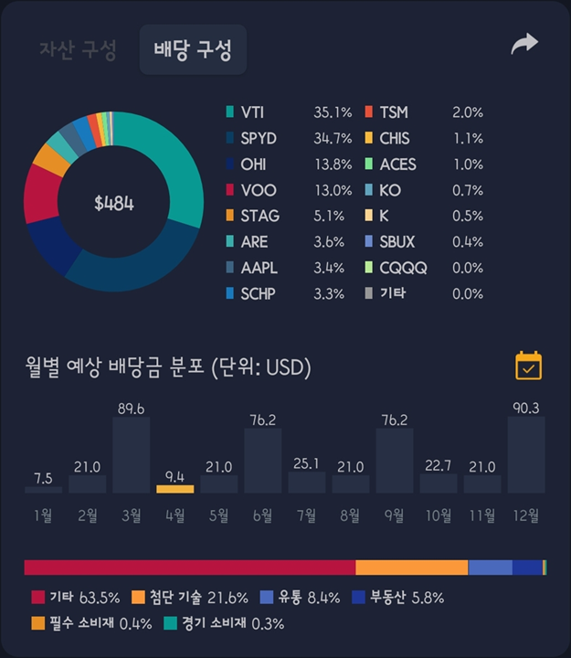 'The Rich' 어플을 이용한 예상 배당금 확인 4월 3일 포트폴리오 기준으로는