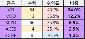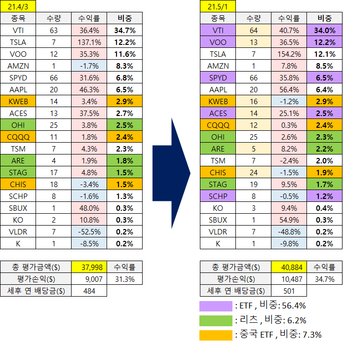 미국 주식 포트폴리오_'21.5/30기준(feat. VTI, SPYD, STAG, CHIS, CQQQ)