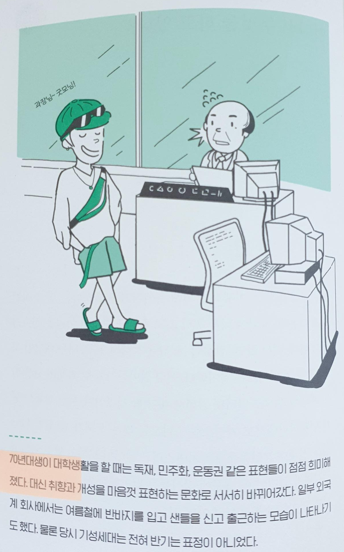 “70년대생이 대학생활을 할 때는 독재, 민주화, 운동권 같은 표현들이 점점 희미해졌다. 대신 취향과 개성을 마음껏 표현하는 문화로 서서히 바뀌어갔다. 일부 외국계 회사에서는 여름철에 반바지를 입고 샌들을 신고 출근하는 모습이 나타나기도 했다. 물론 당시 기성세대는 전혀 반기는 표정이 아니었다.”