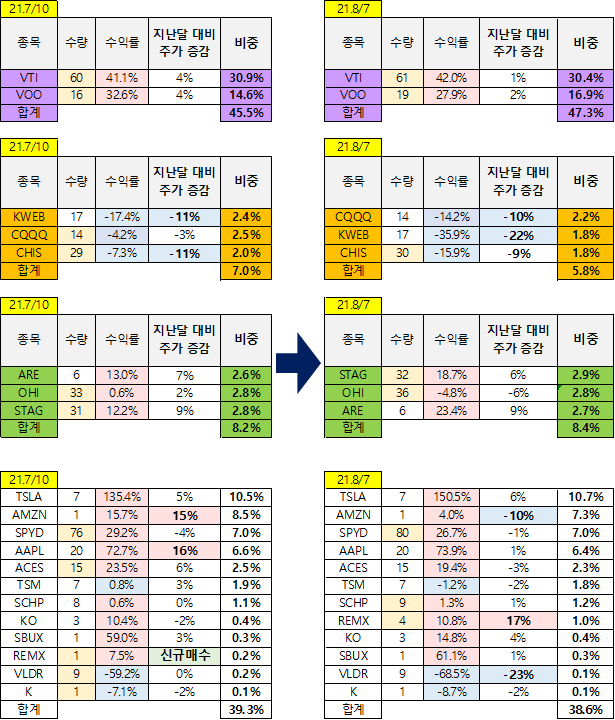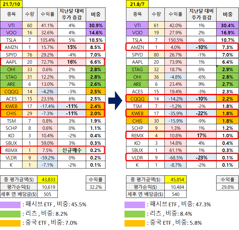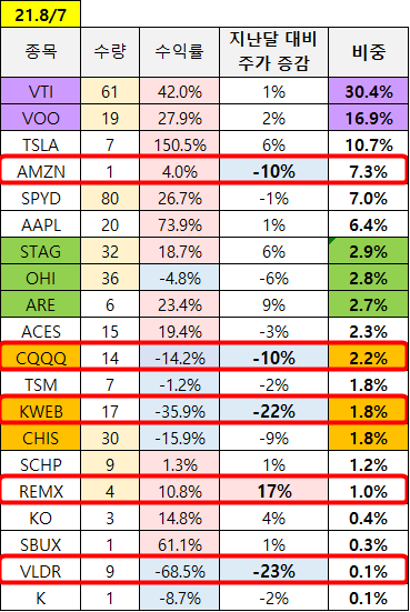 미국 주식 포트폴리오_'21.8/7기준(feat.REMX, VTI, VOO, 중국 빅테크, 중국 ETF, 리츠, OHI, STAG, ARE)▶파공과 함께하는 투자 공부/▷주식 포트폴리오 공개 2021. 8. 8. 17:06