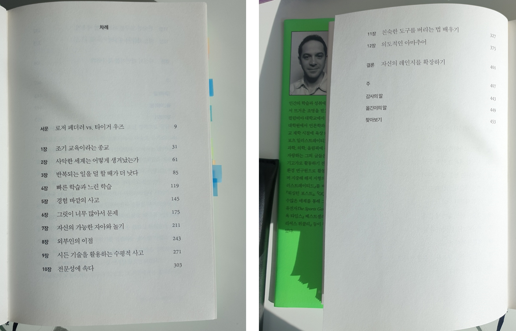 책의 내용은 기대했던 것 이상으로 사례와 근거가 많고, 내용이 풍부하고, 삶을 살아가는 데 있어서, 심지어 앞으로 육아를 함에 있어서도 큰 도움을 받을 수 있는 것들이었습니다. 책의 서문은 유명한 스포츠 스타 로저 페더러와 타이거 우즈의 이야기로 시작합니다. 그래서 매우 흥미롭고 재밌습니다. 서문을 읽으면서 책에 빠져들었다면 뒤에 본문의 내용들도 아마 재밌게 읽으실 겁니다. 사례들과 이야기가 많이 등장하는데, 이야기들이 흥미로우면서도 작가의 의견을 잘 뒷받침해주고있다는 생각이 들더라구요. 저는 이 책을 정말 재밌게 읽었습니다.