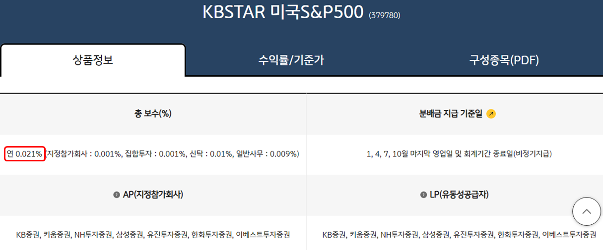 비교적 최근에 우리나라에서도 KB증권에서 KBSTAR라는 브랜드로 뱅가드보다도 더 저렴한 운용 보수를 가진 패시브 ETF들을 출시했더라구요. 대표적으로 'KBSTAR 미국S&P500' 이라는 ETF는 총 운용 보수 비율이 0.021% 입니다. 그래서 저도 최근에는 국내상장된 패시브 ETF에 투자할 때는 KBSTAR를 주로 이용하고 있습니다.