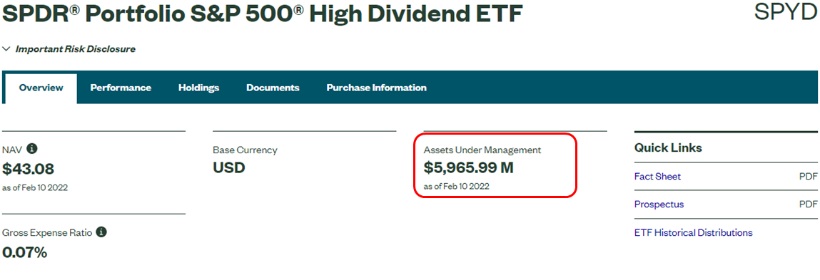 SPYD에 대한 저의 개인적인 생각은 ‘총 자산 규모가 작다는 점을 크게 걱정하지 않아도 될 것 같다’ 입니다. 그렇게 생각하는 이유를 아주 간략하게만 말씀드리면, SPYD가 특정 지수를 추종하는 패시브ETF이면서 SSGA라는 자금이 풍부한 대형 기업에서 운용하고 있다는 점 때문 입니다. 그리고 사실 무엇보다, SPYD 한 종목에 투자하는 금액자체가 최소 몇 억 이상으로 크지 않은 우리 같은 사람들은 이러한 부분을 더더욱 걱정할 필요는 없다고 생각합니다.