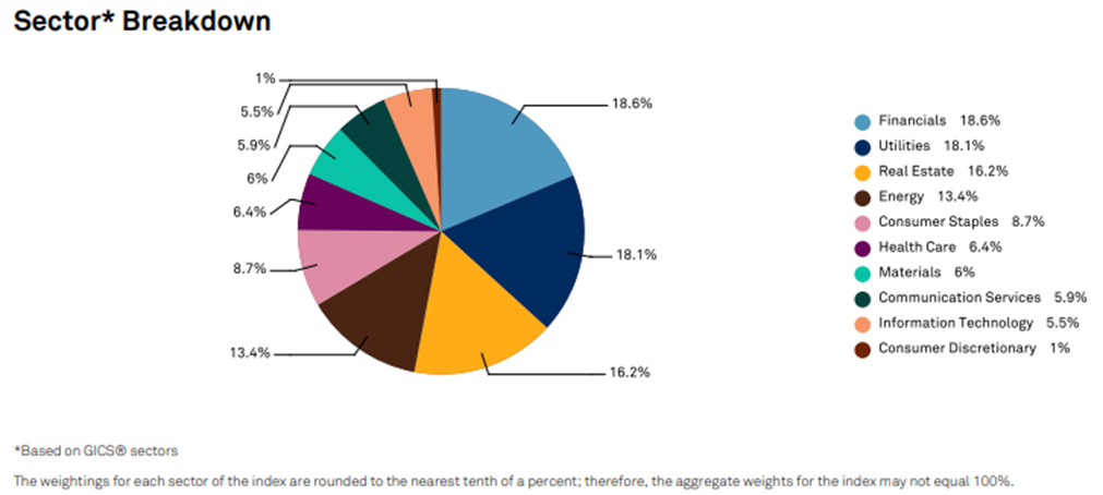출처: S&P 500 High Dividend Index의 FACT SHEET 해당 지수를 구성하는 기업들의 섹터는 금융, 유틸리티, 부동산, 에너지의 비중이 높다는 것을 확인할 수 있음. 이런 섹터의 기업들이 아무래도 배당을 많이 주기 때문에 자연스럽게 SPYD는 배당이 없거나 적은 테슬라, 아마존, 애플 같은 성장주 보다는 주로 소위 가치주라고 불리는 섹터의 기업들로 구성되어있다는 것을 알 수 있음. 이러한 정보는 포트폴리오 전략을 세울 때 도움이 되겠네요.