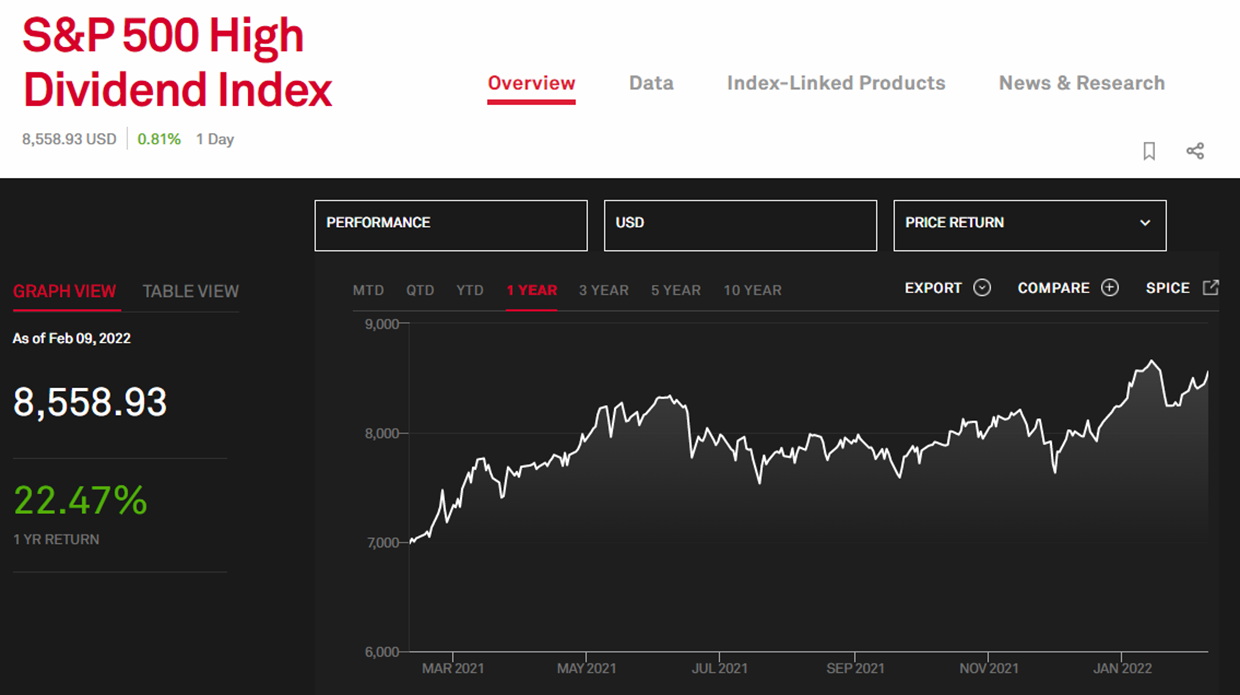 출처: www.ssga.com SSGA 사이트에 나와있는 SPYD가 추종하는 지수는 'S&P 500 High Dividend Index' 입니다. 즉, S&P에서 산출하는 지수를 추종하는 것이기 때문에 S&P 사이트로 가보겠습니다.
