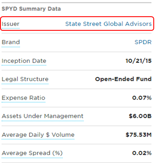 SPYD도 펀드이기 때문에 당연히 해당 펀드를 운용하는 운용사가 있습니다. www.etf.com에 들어가셔서 SPYD를 검색하면 아래와 같은 요약을 보실 수 있습니다.