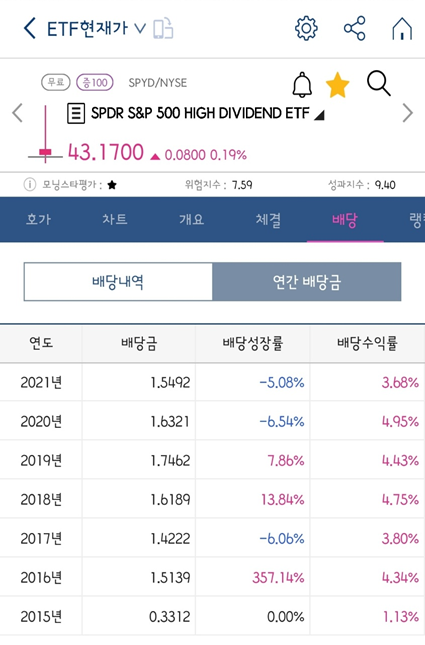 SPYD가 추종하는 지수까지 조금 더 상세하게 살펴봤으니, 우리가 ETF에 투자하기전에 기본적으로 살펴봐야할 항목들은 대부분 확인한 것 같습니다. 이제 마지막으로 SPYD의 배당 수익이 얼마나 되는지 알아보겠습니다. 투자 결정을 하는데 있어서 가장 중요한 정보겠죠. 사실 ETF에서는 배당금이 아리나 분배금이라는 단어를 쓰긴 합니다만 편하게 배당금이라고 이야기하겠습니다. 제가 사용하는 키움증권 영웅문S 글로벌에서 검색해보았습니다.