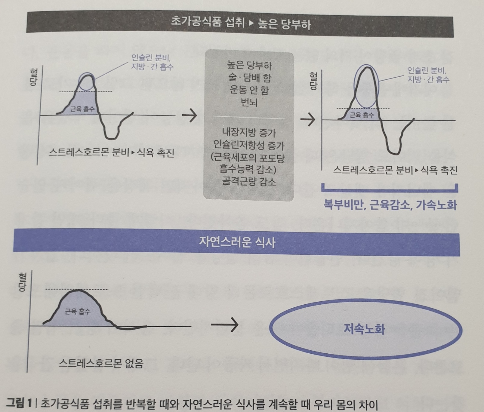 우선, '혈당 변동성'과 관련해서 당이 높은 음식(초가공식품, 정제곡물 등)을 섭취하면 안 되고, 우리가 섭취하여 체내로 들어온 당을 인슐린 분비 없이 흡수할 수 있을 만큼의 충분한 근육이 있어야 한다는 내용입니다. 아래 그림을 같이 보시면 이해하기 쉬울 것 같습니다. 저는 가끔 폭식하는 경우가 있는데, 폭식을 줄이고 근육 운동을 해줘야겠다고 생각했습니다.
