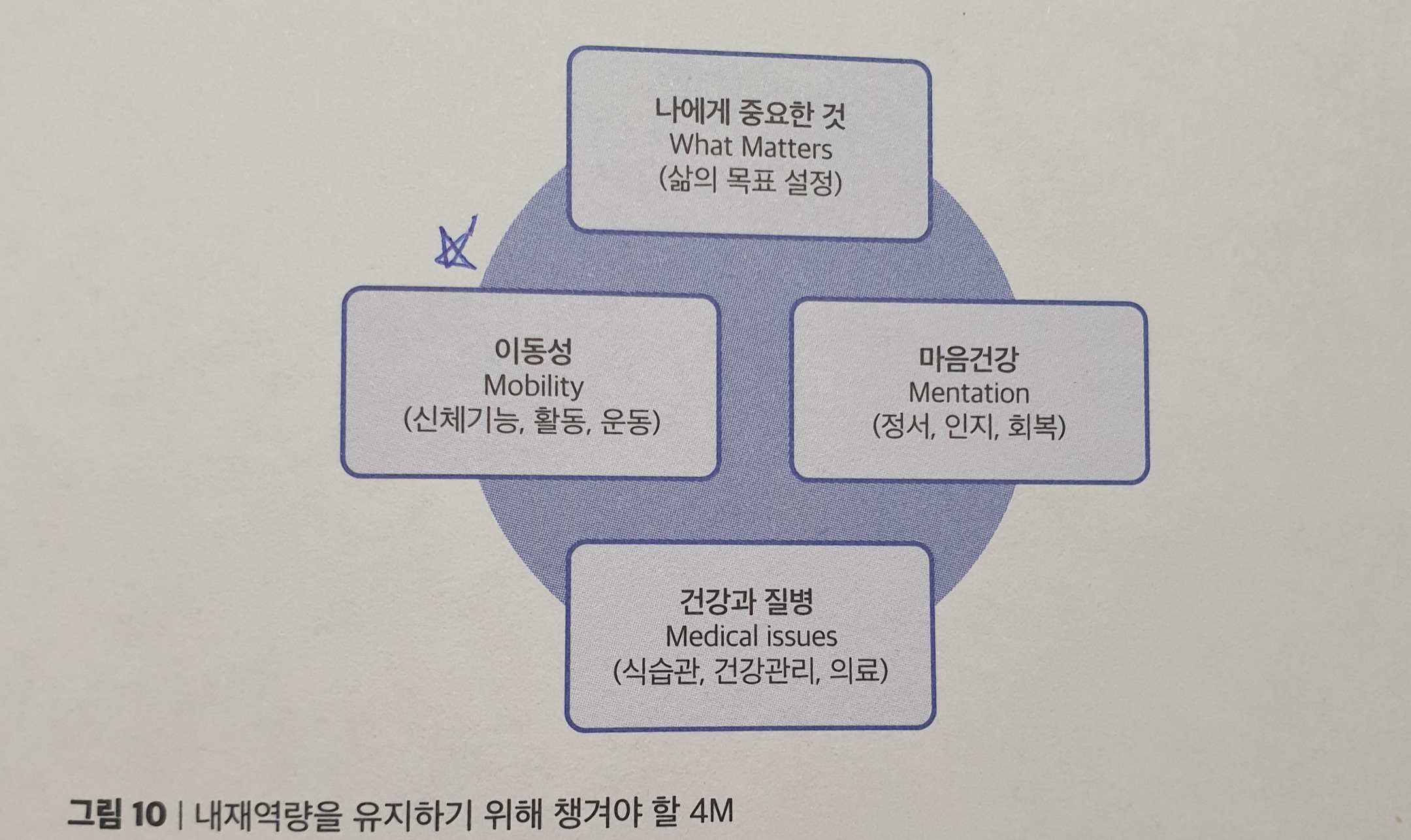 그리고 건강하게 나이 들어가기 위해서는 삶의 여러 부문이 조화를 이루어야 하고 그것이 이 책에서 말하는 4M이라는 4가지 분야를 모두 관리하며 살아가야 한다는 이야기로 1부가 마무리됩니다.
