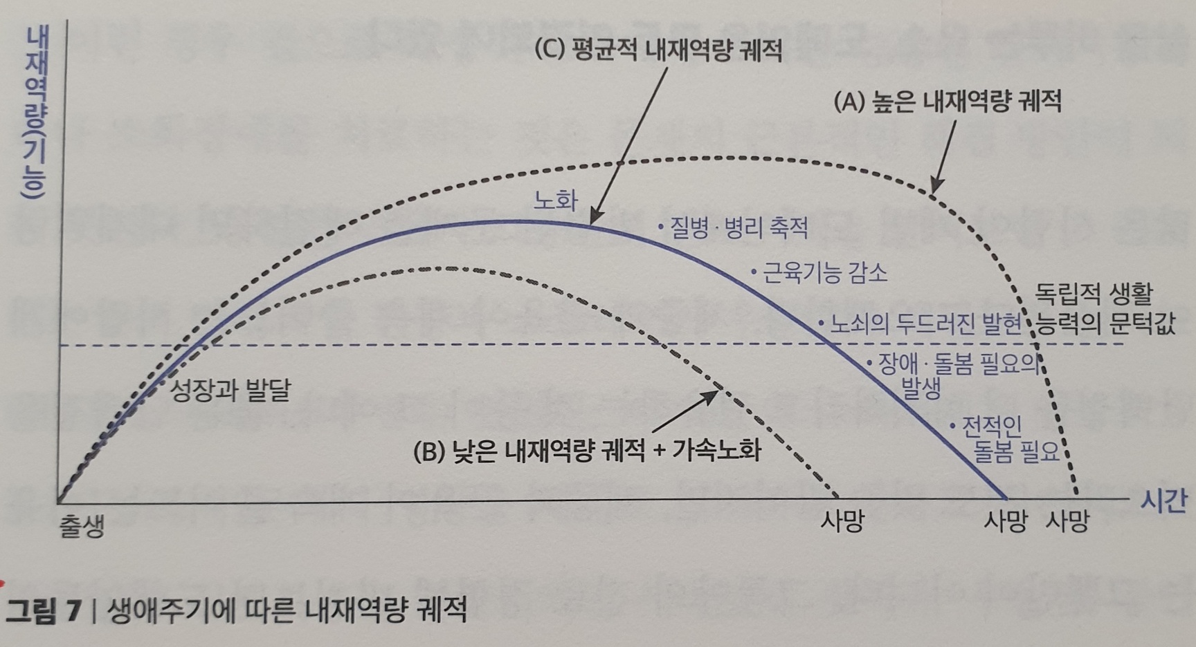 정희원, 《당신도 느리게 나이 들 수 있습니다》, 더퀘스트, 2023, p.75 내재역량을 관리하여 저속노화를 실현한 경우가 (A)입니다. (A) 그래프는 사망하기 직전까지 독립적인 생활을 할 수 있는 능력이 있습니다. 독립적인 생활을 못하게 된 후 죽음을 맞이하기까지의 기간이 아주 짧습니다. 이러면 주변 가족들에게 짐이 덜 되고, 나도 오랜 시간을 불편하게 살다가 사망하지 않아도 됩니다. 반면에 낮은 내재역량으로 가속노화가 진행되는 경우가 (C)입니다. (C) 그래프는 (A)에 비해 독립적인 생활 능력을 상실하는 시기가 아주 빠릅니다. 또한, 독립생활 능력을 상실한 뒤에 사망하기까지의 기간도 (A) 보다 깁니다. 2배가 넘어가는 것 같네요. 단순히 사망하는 시기가 언제인가 보다는 독립적인 생활을 언제까지 할 수 있는가, 그리고 독립적인 생활을 못하게 된 상태로 얼마나 오래 살아가는가가 내 삶의 질을 결정하는 중요한 요소라고 생각합니다.